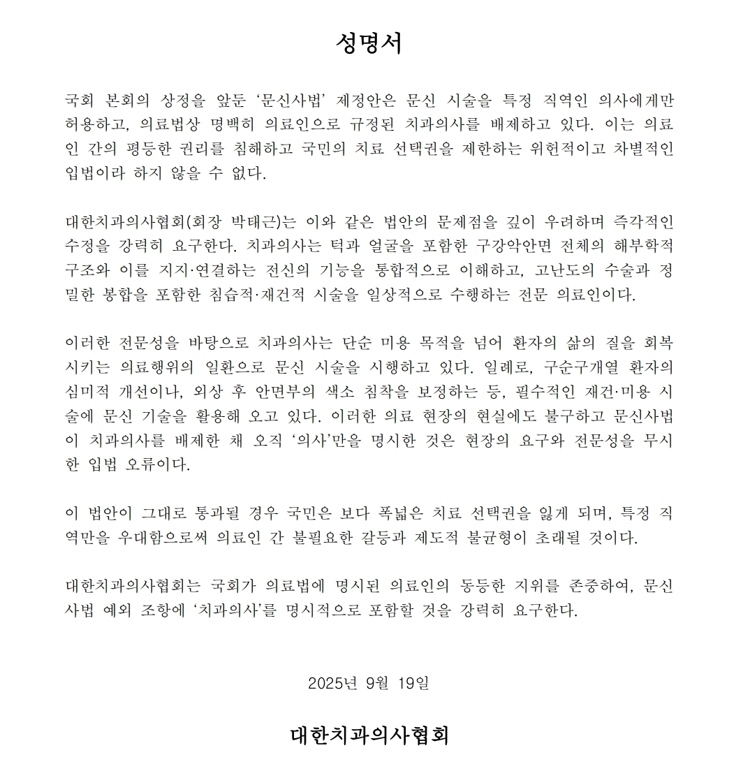 대한치과의사협회()가 9월19일 성명서를 통해 국회 본회의 상정을 앞둔 '문신사법' 제정안에 치과의사를 포함할 것을 촉구했다. 해당 법안이 의사에게만 문신 시술을 허용하고 치과의사를 배제한 것은 차별이며 위헌적 요소가 있다고 지적했다.