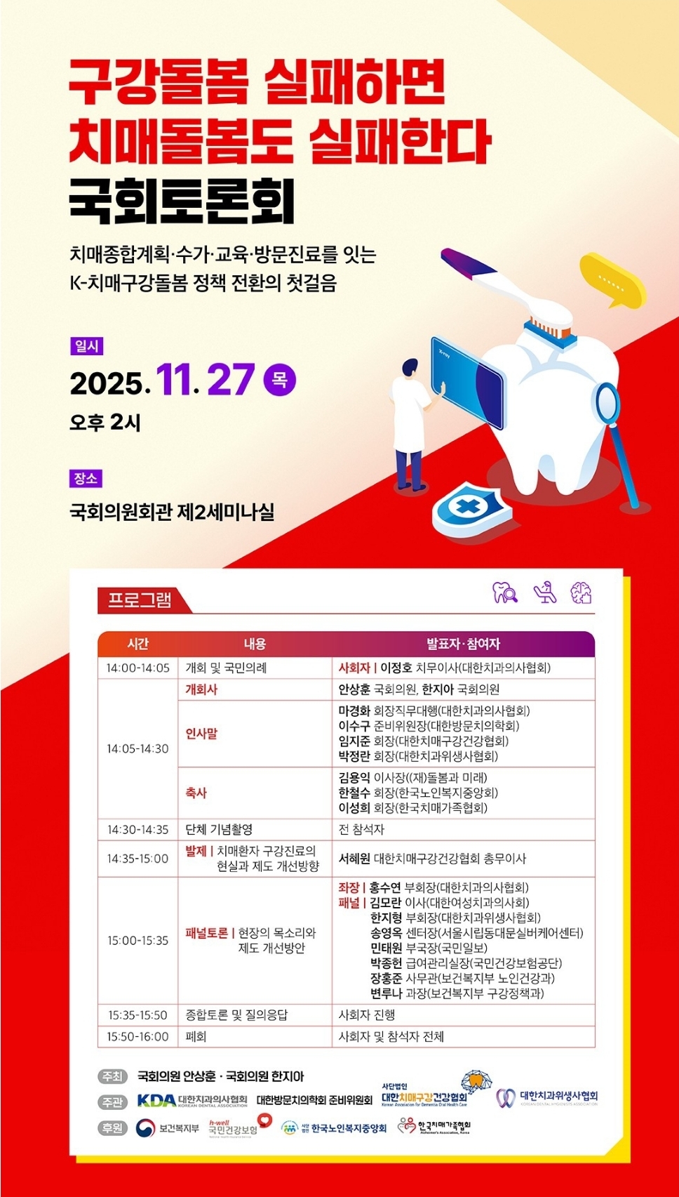 이번 토론회는 지난 국정감사에서 안상훈 의원이 지적한 치매통계 부실과 치매환자 치과진료 공백 문제에 대한 제도 개선을 위해 마련되었으며, 국회의원 안상훈·한지아 의원이 공동주최하고 치협 등이 주관한다. 보건복지부, 국민건강보험공단 등 유관기관이 후원한다.